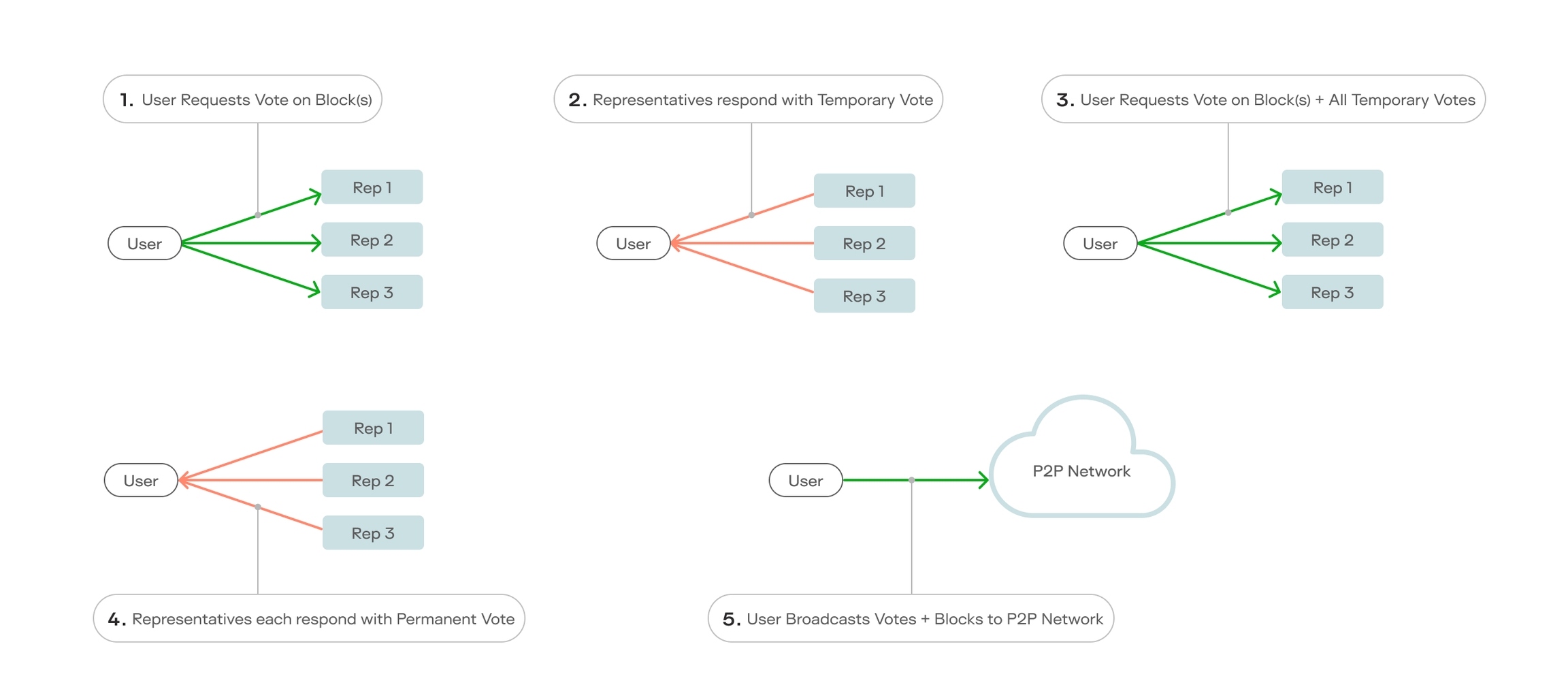 The process begins when a client initiates a vote on a new block(s), sending their request to multiple network representatives. These representatives respond with temporary votes, providing initial validation of the proposed blocks. The client then requests verification of all temporary votes, creating a cross-validation layer. Following this, representatives submit their permanent votes, confirming their final decision on block validity. In the final step, the client broadcasts both the validated blocks and their associated votes to the network, where they are permanently added to the blockchain.