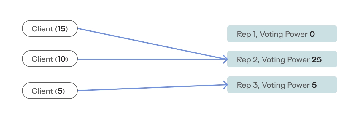 Representatives with more delegated tokens have stronger voting power when deciding whether to add new blocks to the chain. This system ensures that those trusted with more of the network's tokens have greater influence in validation decisions, while still allowing smaller token holders to participate in governance by choosing which representatives to support through delegation. The mechanism creates a balance between network security and decentralized participation.