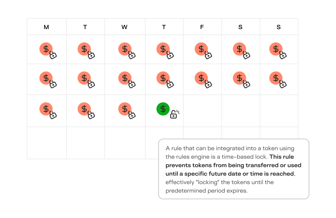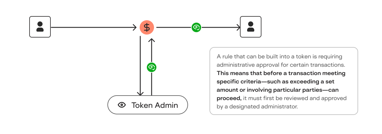 Keeta's blockchain includes a rules engine that allows token creators to attach specific rules to tokens when they are issued, or later in their life-cycle. These rules define how the token can be used, transferred, or managed on the network. For example, a rule might restrict transfers to certain users, set specific transaction dates, or require approval before transactions can occur.