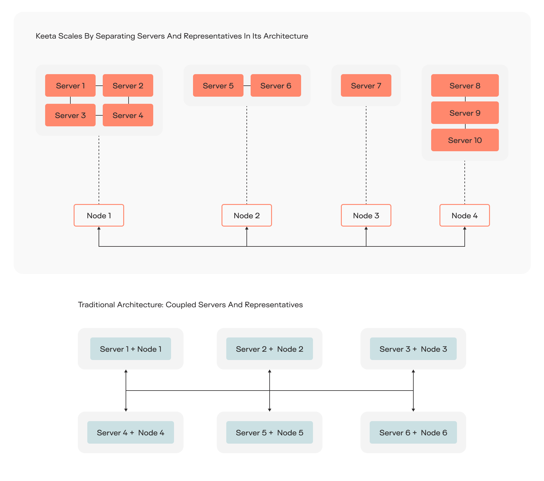 Keeta's architecture separates nodes from servers, allowing multiple servers to support a single node. This design enables both vertical and horizontal scaling without downtime, maintaining consistent transaction throughput under heavy loads and avoiding common network bottlenecks.